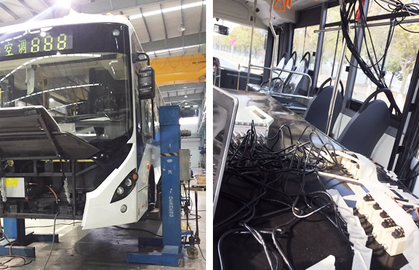 在客車的預設部位分別安裝應變片,連接到儀器端,分別測試客車在靜止和開動過程中各個測點的應變分布情況